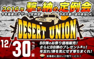 直近の定例会・イベント 射撃体験 詳細を見る 2023/12/1 2026年2月、3月 、4月オキサバ × METユニオン ウェルカムサバゲー 詳細を見る 2025/12/22 2026年子供の日ジュニアガン大会 詳細を見る 2025/12/28 サバゲ祭り2026 詳細を見る 2026/1/27 特殊ルールで楽しむ中級者向け「ジュニアガン・アドバンス」|2026年4月18日 詳細を見る 2026/3/6 ジュニアガン戦最高峰「ジュニアガン・マスター」/2026年4月25日 詳細を見る 2026/3/7 #チョロサバ ~ちょろっと遊べる痛くない簡単サバゲ~ 詳細を見る 2026/3/18 2026年4月21日平日定例会 詳細を見る 2026/3/25 2026年4月23日平日定例会 詳細を見る 2026/3/25 2026年4月29日GW合同定例会 詳細を見る 2026/3/25 2026年4月30日GW合同定例会 詳細を見る 2026/3/25 親子で楽しめるサバゲー体験「ジュニアガン・ベーシック」|2026年5月6日 詳細を見る 2026/4/1 新着 無限復活ビギナー祭り/2026.6.21 詳細を見る 2026/4/15 ARCHIVE 【終了】 12月17日(土) ベース定例会 詳細を見る 2016/12/9 【終了】 12月16日(金) ベース定例会 詳細を見る 2016/12/9 【終了】 2017新春特別定例会(ベース&M.E.T) 詳細を見る 2016/12/2 【終了】 12月6日(火) ベース定例会 詳細を見る 2016/12/1 【終了】 デザートユニオン2016年撃ち納め定例会(12月30日・金) 詳細を見る 2016/12/1 【終了】 12月1日(木) ベース定例会 詳細を見る 2016/11/25 【終了】 11月24日(木) 定例会 詳細を見る 2016/11/19 【終了】 11月23日(水,祝) 定例会 詳細を見る 2016/11/15 【終了】 11月20日(日) 定例会 詳細を見る 2016/11/13 【終了】 11月19日(土) 定例会 詳細を見る 2016/11/12 Previous 1 … 150 151 152 153 154 155 156 Next