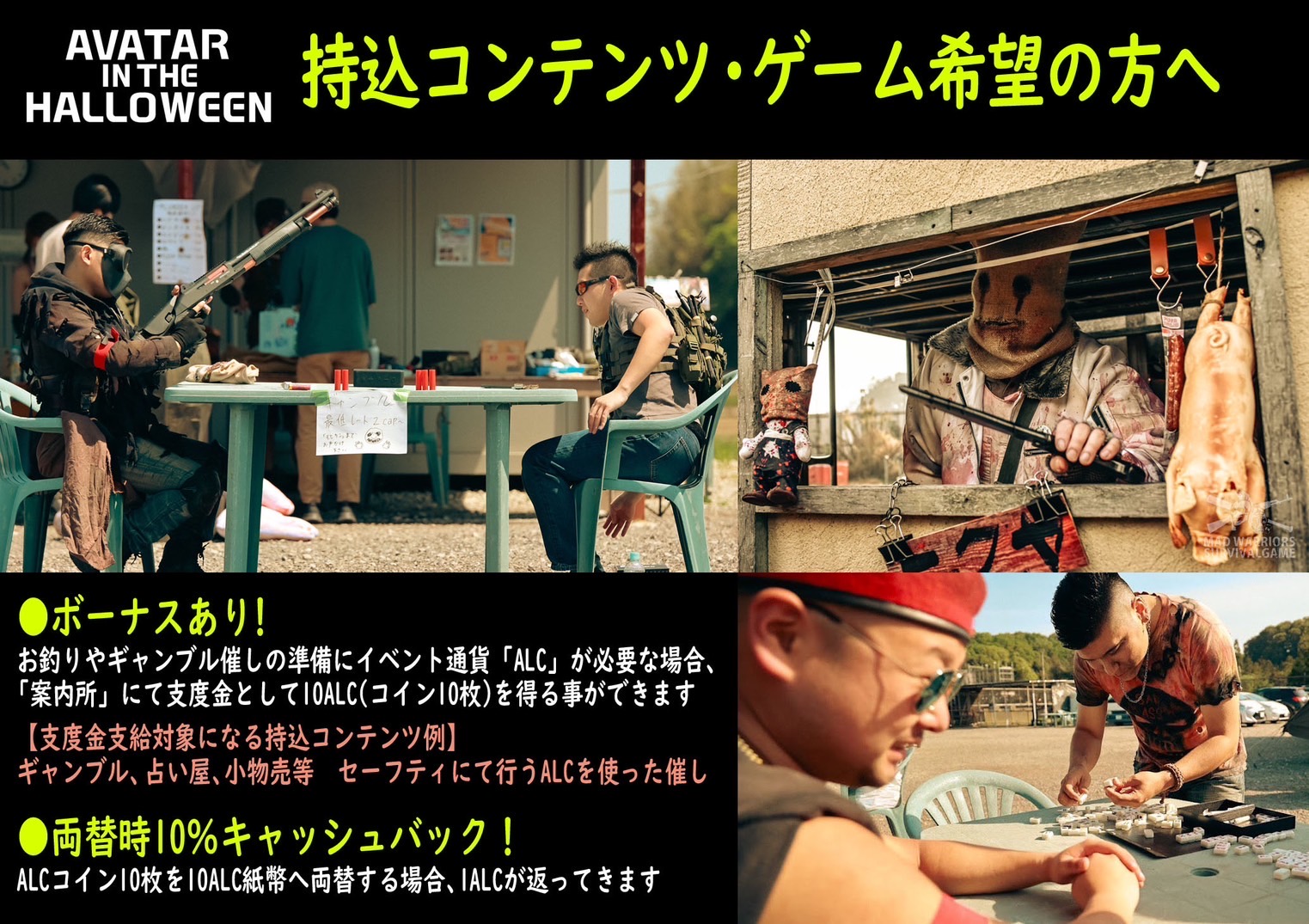 ゲーム通貨の両替や、賭け試合の券売、ワークショップ、衣装レンタル、イベント通貨によるオークションを実施。