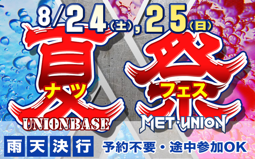 【ユニオンベース×METユニオン】夏祭(ナツフェス) http://sabage-union.com/1296.html サバイバルゲームフィールド「ユニオンベース」定例会のレギュレーションなど、詳しい情報はこちらでご確認ください 参加予約