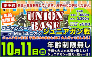 ジュニアガン定例会 ユニオンベース × METユニオン ジュニアガン戦開催のお知らせ 10月11日に開催予定のジュニアガン戦は 時間を変更して開催させて頂く事となりました。 通常時は8時受付スタート10時から開会式を行いゲームスタートでした […] 2020/10/3 詳細を見る