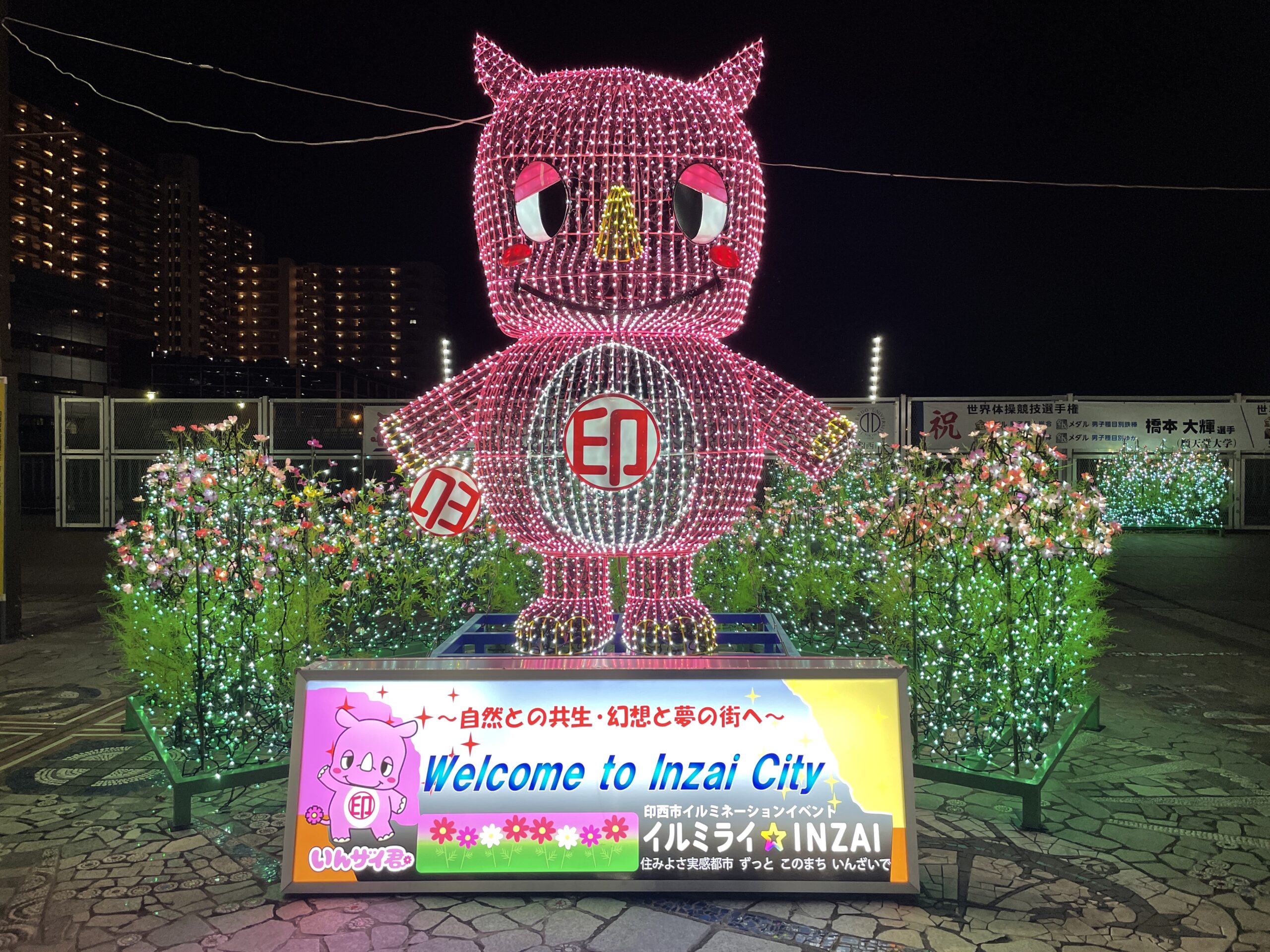 駅の出入口には印西市のマスコットキャラクター「いんザイくん」がライトアップされています。
