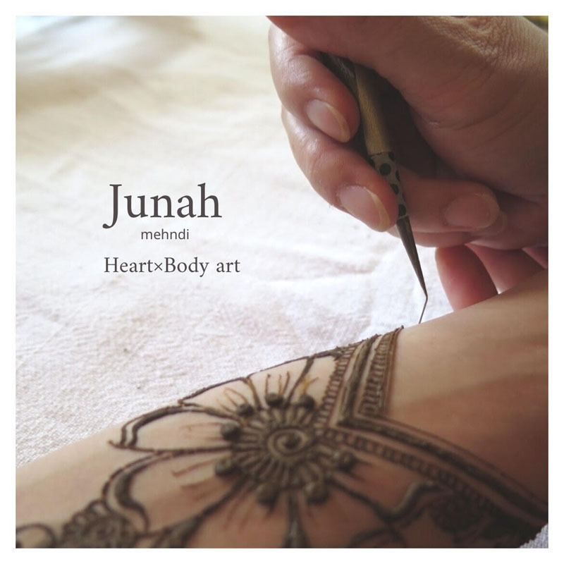 junah mehendi ・ヘナ(メヘンディ)アート インドや中東などで幸せを呼ぶアートとして愛されているヘナアートをボディに描きます。 癒し、ヒーリング効果もあると言われ、婚礼の際に花嫁がボディに描いて幸せを願ったり、 魔除けとして親しまれています。 ・ヴェールホワイトヘナアート 速乾性のあるお肌に優しいボディ用インクでメヘンディアートです。 ・ハンドメイド アクセサリー、バックなどの販売もしております。 関連リンク