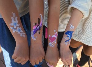 顔や腕にフェイスペインティング専用絵の具でイルカやうさぎ、ハートなど人気の絵柄を描きます。 また、今回は無地のお面に自由に絵付けをしてもらう「お絵描きお面」も行います。